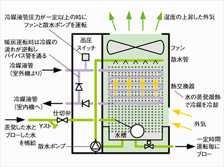 공냉 빌딩용 멀티 공조 시스템의 냉방 운전 효율을 높이는 「냉매 서브 쿨 시스템」의 발전형으로서, 냉매를 물로 냉각하는 열교환기와 냉각탑을 일체화한 「에바틸드 유닛」을 개발했습니다.
